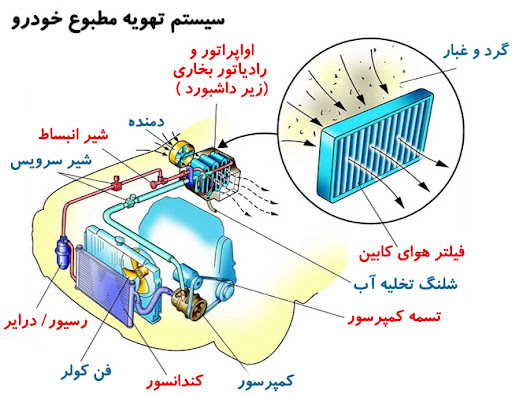 این قطعات شامل کمپرسور، کندانسور، شیر انبساط، اواپراتور، مایع مبرد، کلید کنترل فشار، مجموعه لوله و شلنگ، خشککن هوا و فیلتر کابین میباشد که در ادامه مقاله یا این قطعات بیشتر آشنا می شویم .